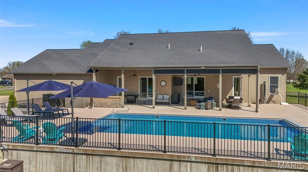 This is the home you've been waiting for-a rare blend of luxury, space, and resort-style living that seamlessly blends indoor and outdoor living into one cohesive space.Featuring 5 bedrooms and 4.5 baths, this home offers soaring 11' ceilings in the main living areas and primary suite, with 9' ceilings throughout the rest of the home and finished basement. The custom kitchen showcases granite and quartz countertops, high-end cabinetry, and seamless design that extends throughout multiple spaces in the home.Your primary suite is a true retreat, a large primary bathroom with dual sinks, heated floor, walk in closet with built in cabinetry, separate tub and shower with walk out access to your beautiful covered patio, including pull down screens.Custom, high-end cabinetry continues throughout the home including in the office with a built in desk and storage, mudroom with a well planned drop zone and laundry room featuring additional storage as well as a counter perfect for folding. 3 additional, generous sized, bedrooms all featuring walk in closets round out the main floor.Enjoy whole-home, zoned surround sound system across the main living areas, basement, patio, pool, and theater downstairs. The finished basement adds exceptional flexibility with a kitchenette/bar, bedroom, full bath, fitness den, rec room, storage, and a built-in safe room.Step outside to your private retreat featuring a resort-style pool with tanning ledge, KoolDeck surface, electric safety cover, and a heat pump for extended seasonal use, all enhanced by professional lighting. Don't forget to check out the covered grilling patio with propane hookups for all your grilling appliances, no more lugging propane tanks around.Additional highlights include a 40x60 outbuilding with a concrete floor and water, a second outbuilding with a concrete floor and water, whole-house generator, LifeSource water filtration system, 1000 gallon owned propane tank with gas grill hookup, central vacuum, heated garage, and more.With spacious living areas, premium upgrades, and thoughtfully designed indoor and outdoor spaces, this home delivers both comfort and functionality. Every detail has been accounted for, be sure to request the Special Feature List.