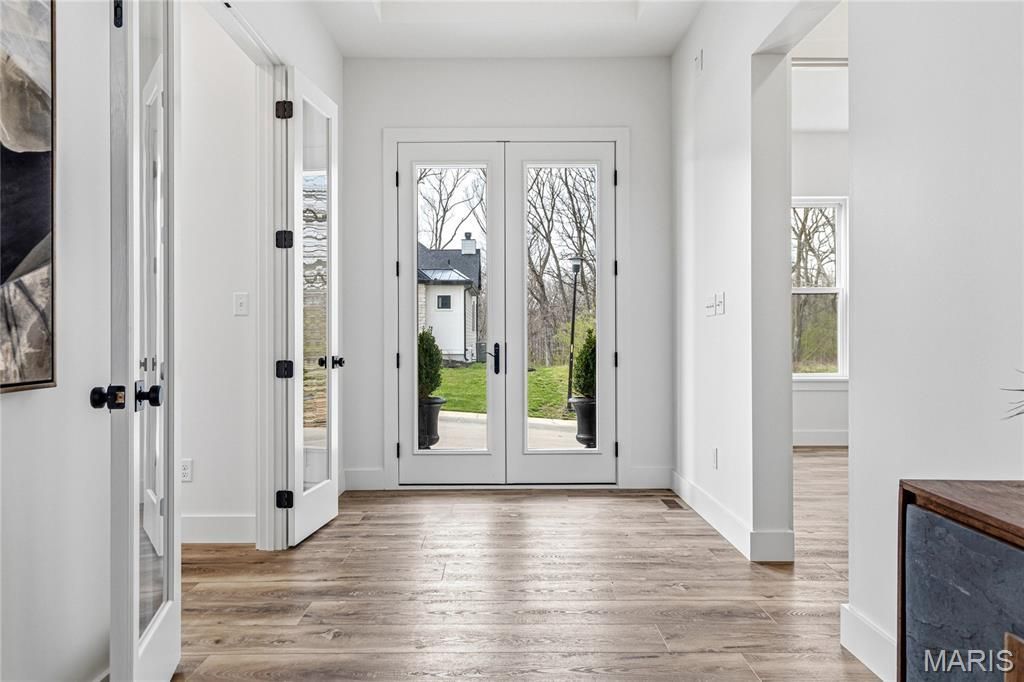 Nestled in the newly developed Missouri Bluffs community-anchored by a Tom Fazio-designed golf course and described as 'one of the most beautiful sites in the State of Missouri-this exceptional new construction ranch blends timeless New England cottage architecture with transitional luxury. Thoughtfully designed by renowned architect Tim Busse and expertly built by Homes By Whittaker, every detail showcases elevated craftsmanship and premium upgrades. A charming covered front porch welcomes you to an impressive entry featuring 8-foot double atrium doors, opening to a dramatic two-story foyer and private study (optional second bedroom) with elegant French doors. Inside, a timber-beamed cathedral ceiling and expansive windows create a bright, airy ambiance throughout the dining area and stunning great room, highlighted by a floor-to-ceiling stone fireplace. The designer kitchen is a true showpiece, featuring white Shaker cabinetry, quartz countertops, stainless steel appliances, and an expansive 12-foot center island-perfect for entertaining or everyday living. The vaulted primary suite offers a peaceful retreat with two custom walk-in closets and a spa-inspired bath complete with a freestanding soaking tub. A third bedroom and full bath round out the main-level living space. Situated on a private, wooded cul-de-sac lot, the home also features an inviting screened outdoor living area and a spacious three-car garage. Conveniently located just minutes from Chesterfield Valley, with easy access to Highways 40 and 94, this home offers both tranquility and accessibility.